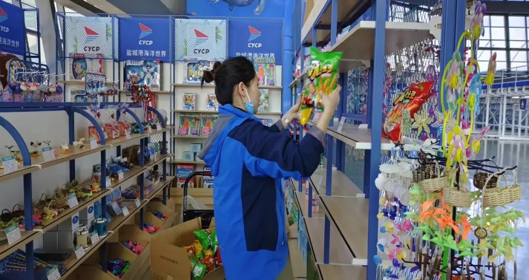 景区各小组成员在部门负责人的带领下积极备战活动前的各项准备工作。此次活动,结合大丰港动物园客流量资源优势,借助海洋剧场海豚错峰表演时间,将游客进行引流。同时,为满足游客多样化需求,促进景区二次消费,海洋剧场商品柜台准备了数量充足、类别丰富的商品品类,工作人员正在提前往商品陈展架上摆满各式各样的商品。