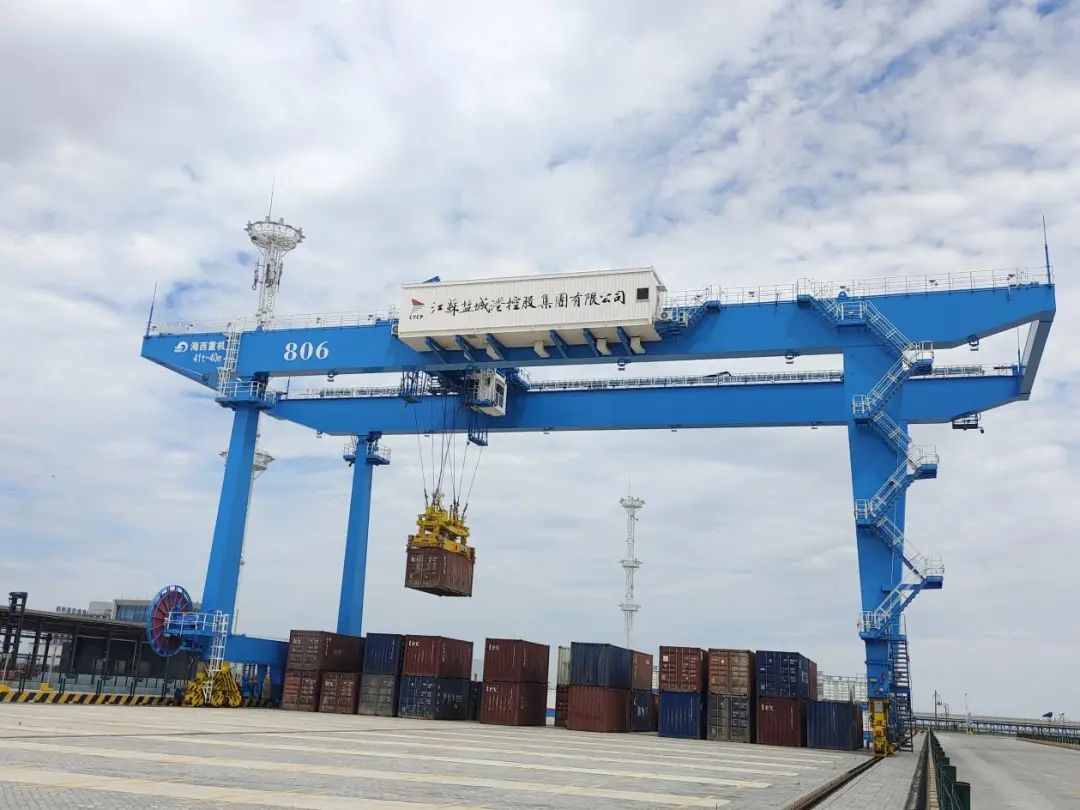 龙门式起重机(俗称龙门吊),是桥架通过两侧支腿支撑在地面轨道上的桥架型起重机。在港口,主要用于室外的货场、料场货、散货的装卸作业。它的金属结构像门形框架,承载主梁下安装两条支脚,可以直接在地面的轨道上行走,主梁两端可以具有外伸悬臂梁。龙门式起重机具有场地利用率高、作业范围大、适应面广、通用性强等特点,盐城响水重件码头额定负荷达到600T,能满足起吊几乎所有常见港口装卸物资。