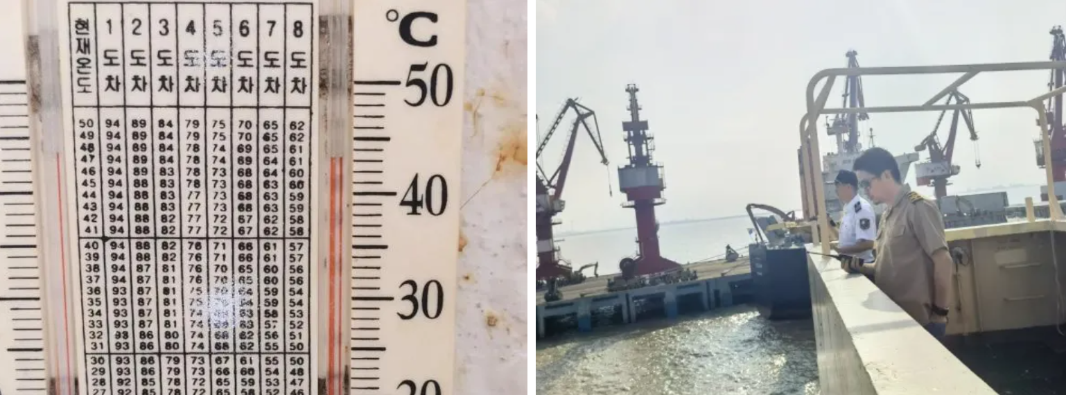 “蒸烤”在一线,持续的高温阴雨天气,让引航工作一直处于蒸汽笼内的湿漉环境,每一次的引航都是一次全身“湿身秀”。尤其近日引领的满载铁矿的“雪松”轮,甲板上的温度达到了40℃之上,加上雨水蒸发的一阵又一阵热气,模糊着视线的同时也在“蒸烤”着引航员的身心。即便如此,引航员们依旧一艘又一艘的引领着船舶安全进出港航行。