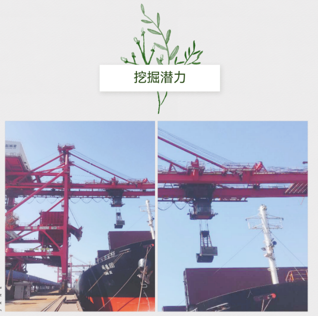 深入挖掘设备潜能,实施了一系列“赋能升级”计划。改进卸船机水渣抓斗工艺,从原有的14m³、21T的水渣抓斗采购16.9m³、25T的抓斗,使其在满足额定起重量要求的同时,具备煤炭备用抓斗的功能;对堆料机进行流量升级,通过改造漏斗、支架等细节,平均流量从1800T/H提升至2200T/H,在提高堆料机的稳定性和效率的同时,也降低了新设备采购的成本。