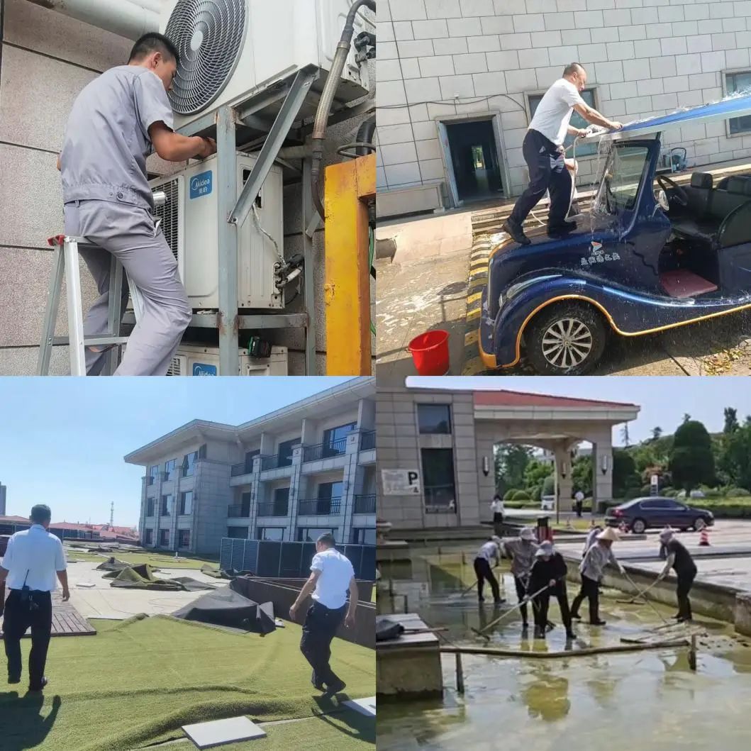 高温击不垮盐城港人对事业的热爱、对岗位的忠诚。顶着烈日的忙碌身影,铺被风吹散的草坪、清理遍布绿色苔藓的水池、清洗观光车、维修设备.....,他们用强烈的责任心与可靠的专业技能,让客户用得放心。