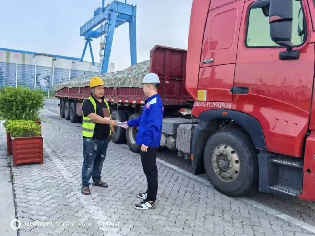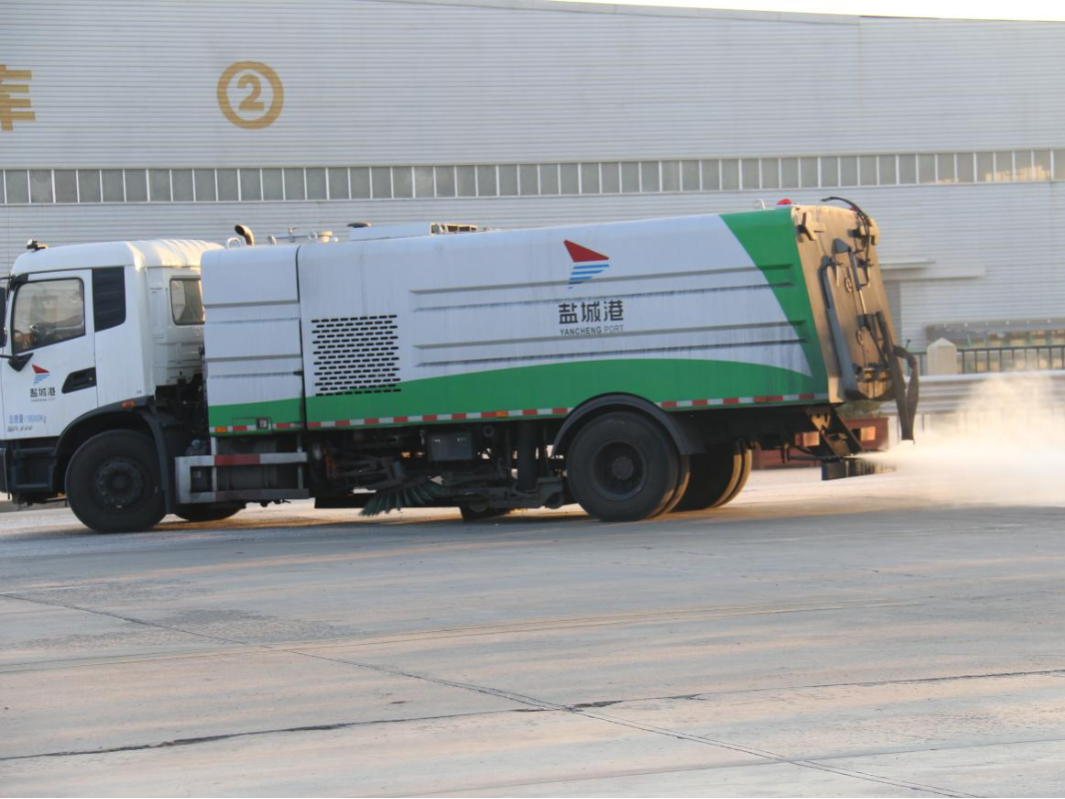 为进一步做好现场安全管理工作,对运输车辆作业前进行安全检查,要求司机严格按照港区限速要求行驶,尤其是磅房、转弯处,必须提前减速,避免急刹。与此同时,为防止土石遗撒,最大程度减少对码头、道路及行驶环境的安全影响,采取“动态巡查+人工清扫+机械配合”的作业模式,对每台运输车辆进行严密苫盖,在车辆运输路线上布置清扫车,通过“人工扫帚+清扫车”清扫等组合方式,确保港区环境干净整洁。