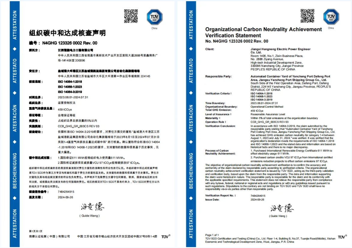 9月26日,盐城港大丰港区江苏盐城港航运集团有限公司自动化集装箱堆场获得TUV南德意志集团颁发的《组织碳中和达成核查声明》,成为国内首个获得“碳中和”认证的堆场项目(TUV南德意志集团成立于1866年,总部位于德国慕尼黑,是世界上规模最大、最古老的TUV检验机构)。这是继2023年盐城港自动化集装箱堆场获得碳中和承诺审定以来,盐城港在落实国家“双碳”目标,积极推动港口绿色低碳发展,奋力为盐城勇当全省发展新质生产力重要阵地“碳路先锋”做出的又一项重要实践。
