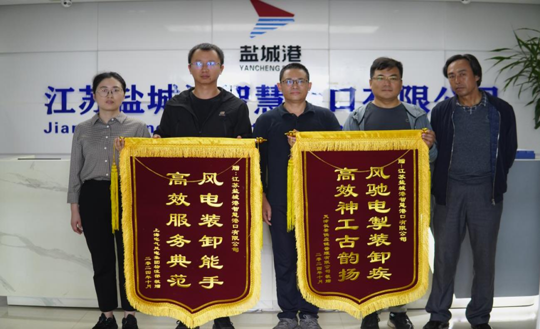 近日,智慧港口公司收到天津长景供应链管理有限公司和上海电气风电集团物流部送来写有“风驰电掣装卸疾,高效神工古韵扬”“风电装卸能手,高效服务典范”字样的两面锦旗,字里行间,映照着客户对盐城港装卸服务最诚挚的谢意和加倍的认可。