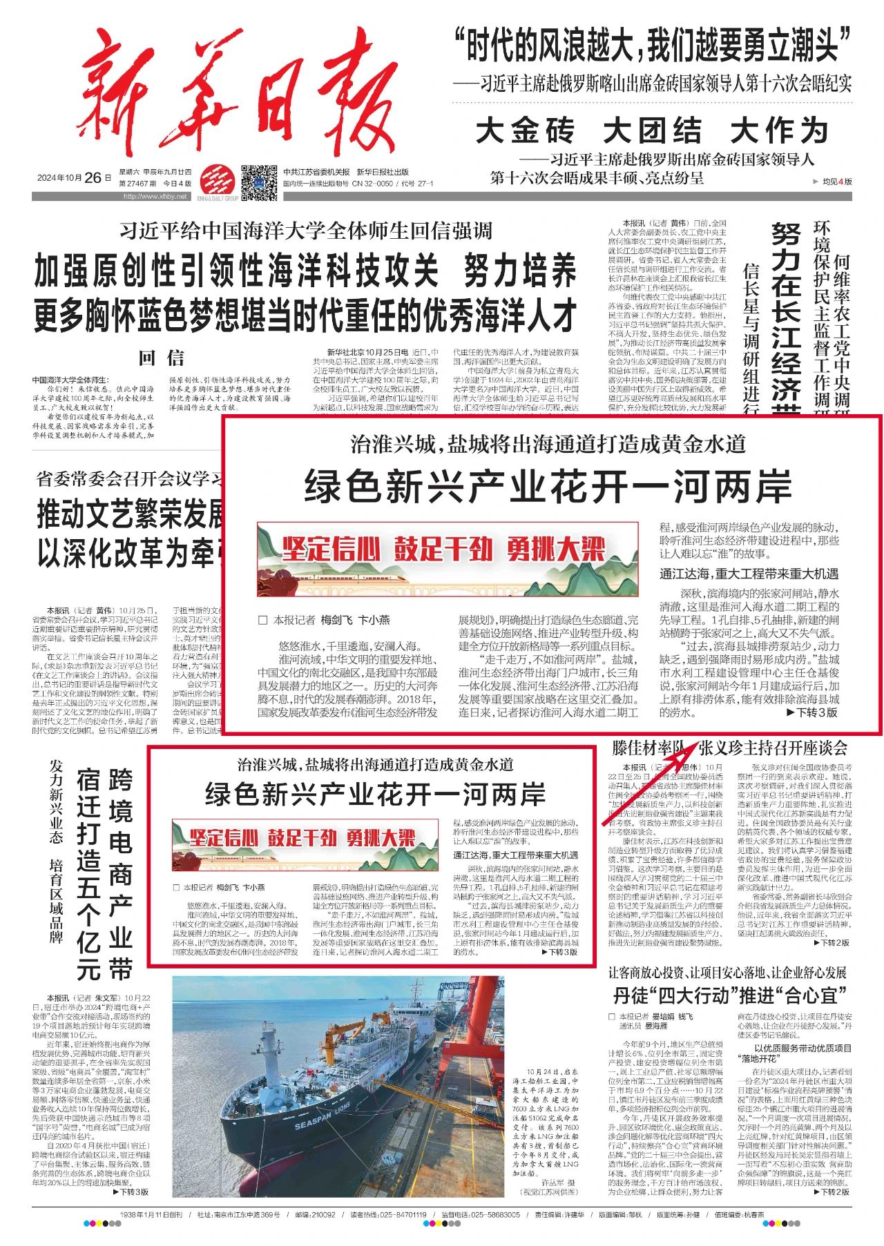 《新华日报》头版聚焦盐城治淮兴城,盐城将出海通道打造成黄金水道