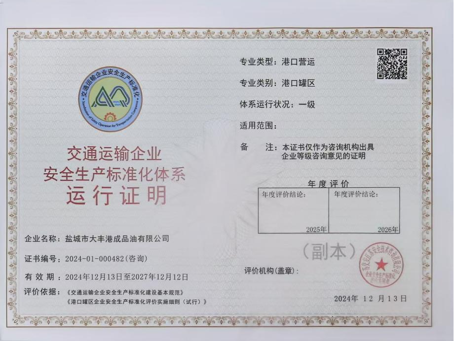 近日,盐城港大丰港区成品油公司顺利取得“通运输企业安全生产一级标准化证书”,标志着成品油公司在安全生产管理体系精细化、规范化、标准化建设上实现了提质升级。