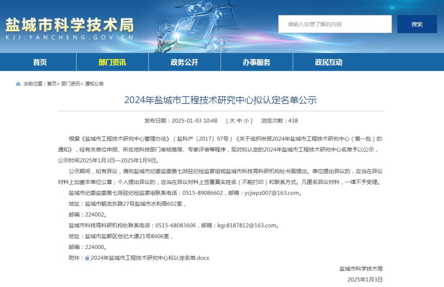 近日,盐城市科学技术局发布了《关于2024年盐城市工程技术研究中心认定名单》,其中科技集团成功入选,被认定为“盐城市智慧港口智能监管系统工程技术研究中心”。这一荣誉标志着科技集团在智慧创新领域上又迈出了坚实的步伐。