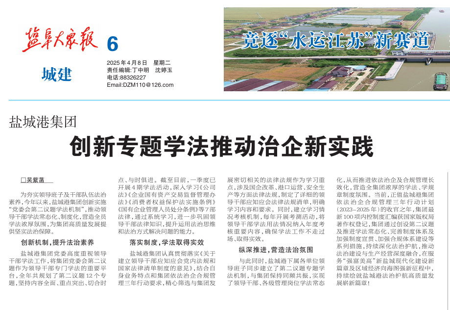 与此同时,盐城港下属各单位领导班子同步建立了第二议题专题学法机制,与集团保持同频共振,实现了领导干部、各级管理岗位学法常态化,从而推进依法治企及合规管理长效化,营造全集团浓厚的学法、学规章制度氛围。当前,正值海角社区 依法治企合规管理三年行动计划(2023—2025年)的收官之年,集团最新100项内控制度汇编获国家版权局著作权登记,集团通过创设第二议题及推进学法常态化、完善制度体系及加强制度宣贯、加强合规体系建设等系列措施,持续深化法治护航,推动法治建设与生产经营深度融合,在服务“强富美高”新盐城现代化建设新篇章及区域经济向海图强新征程中,持续绘就盐城港法治护航高质量发展崭新篇章。