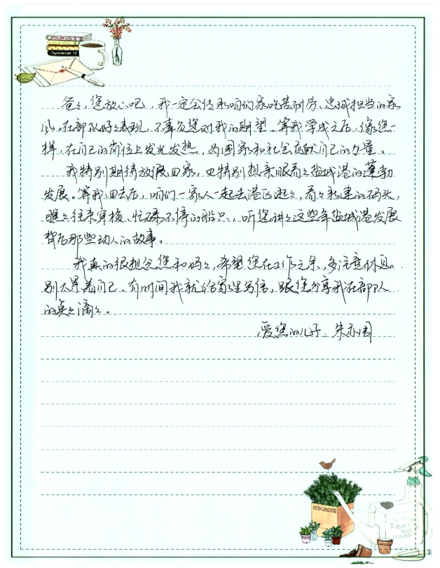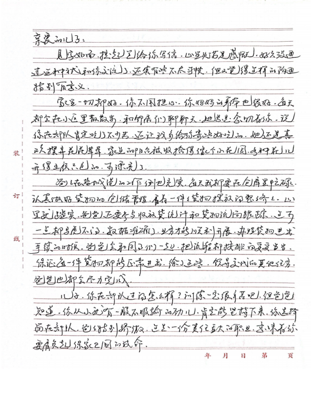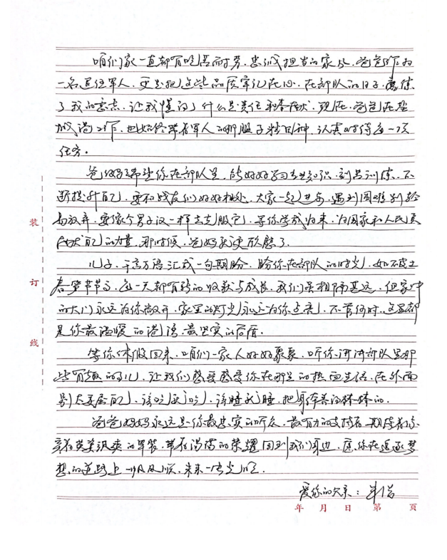 字里行间流露出对双亲的敬仰之情,细数在军旅或职场中的成长点滴,并郑重承诺将“忠诚、奋进”的家风薪火相传,以实际行动回馈家庭与社会,同时深切期盼家庭团聚的美好时光。