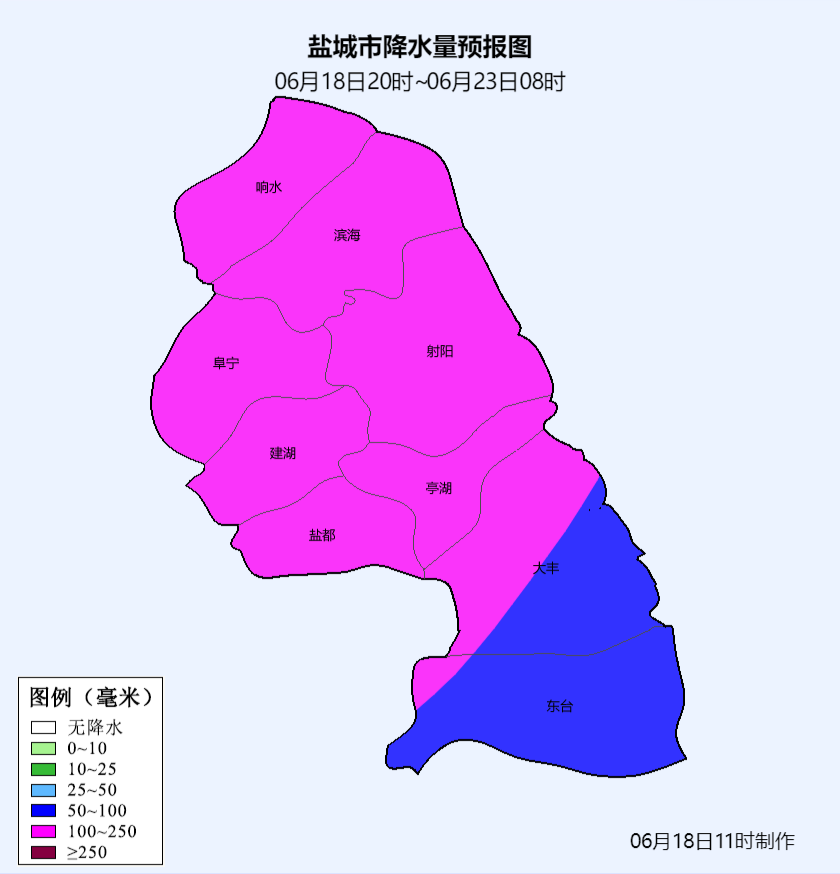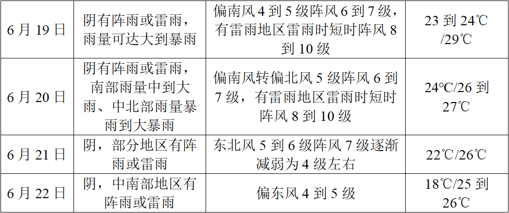 19-22日过程雨量:80~150毫米,局部180~220毫米,雨量主要集中在19-20日,21日雨带逐渐南压,22日降水主要在中南部地区。降雨期间局地可能伴有雷电、小时雨强40~70毫米的短时强降水和8~10级雷暴大风等强对流天气。