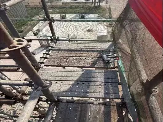 廊道外脚手架发现一处踏板缺失,且无安全提示牌,作业人员有坠落危险,安全风险较高,需即刻整改。