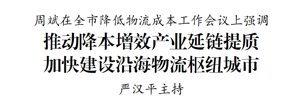 8月15日,全市降低物流成本工作会议召开。市委书记周斌出席会议并讲话。他强调,要深入学习贯彻习近平总书记关于现代物流的重要论述和对江苏工作重要讲话精神,认真落实中央决策部署和省委省政府工作要求,全面推动物流降本增效、产业延链提质,加快建设具有全国影响力的沿海物流枢纽城市。市委副书记、代市长严汉平主持会议。