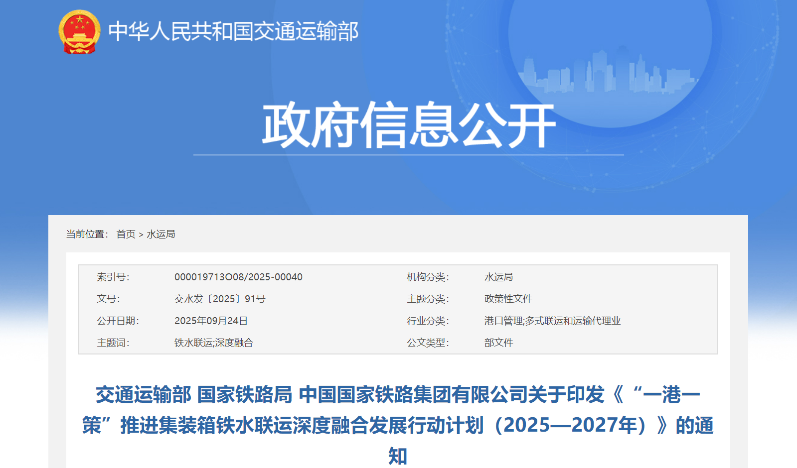 为深入贯彻落实党中央、国务院决策部署,优化调整运输结构,进一步发挥综合运输优势,促进有效降低全社会物流成本,现将《“一港一策”推进集装箱铁水联运深度融合发展行动计划(2025—2027年)》印发给你们,请认真抓好落实。