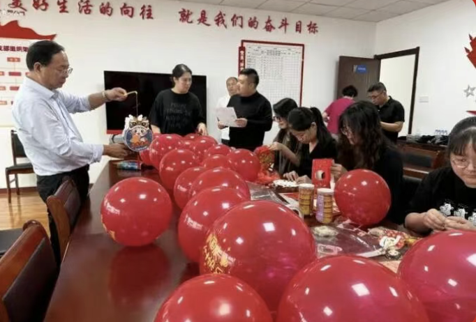 活动伊始,红色的国旗与五彩气球便在指尖翻飞成景。员工们分工协作,挂灯笼框架、铺赏月桌布,半小时内,活动室已氤氲着双重喜庆——墙面的国旗辉映着案头的桂花枝,提前备好的兔形灯架静待添彩,节日的热闹氛围瞬间拉满。