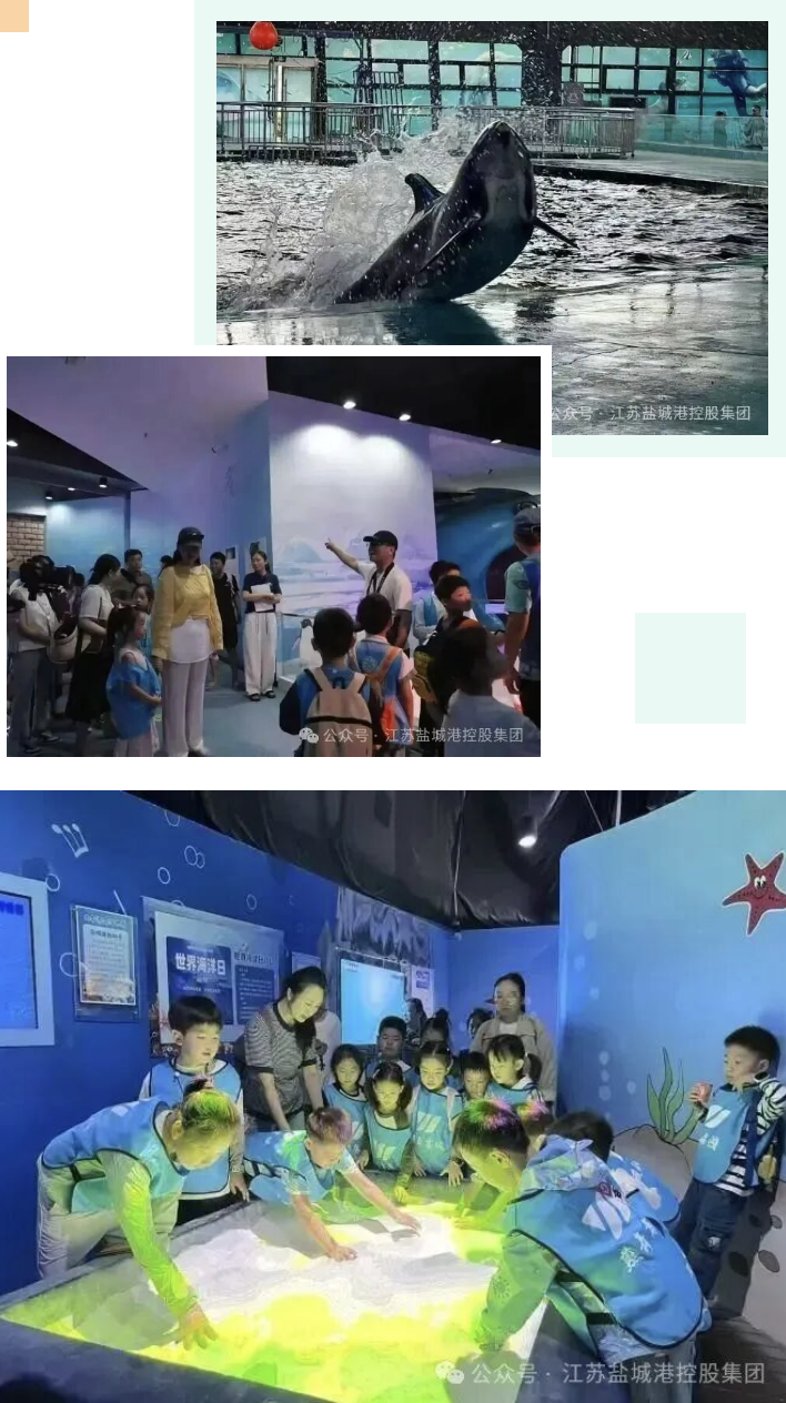 最后,孩子们踏入升级后的大丰港海洋世界科技馆,沉浸式体验瞬间拉满——VR实景秒变“海盗王”、5D星空影院带你“魂穿”深海秘境。“海洋世界寻宝”活动一开启,孩子们化身“寻宝小达人”,欢快穿梭在场馆内,“看,我找到一个”“耶!我找到两个”,欢呼声此起彼伏。讲解员以生动故事拆解复杂科学知识,让孩子们在互动中主动探索,实现“玩中学、学中悟”。海洋剧场内,主持人进行着海洋知识科普,训练员与聪明的海豚默契配合演绎着高空华尔兹,让孩子们在欢笑声中树立守护蓝色家园的意识。活动尾声,大家共同回顾全天收获,分享难忘瞬间,为这场研学之旅画上圆满句号。