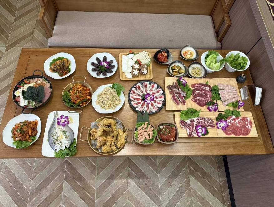 598元套餐(多人):牛五花、雪花牛板腱、LA 牛排、部队火锅、整只炸鸡等韩式经典,搭配南瓜汤、水果茶、生菜无限续,聚餐氛围热烈。