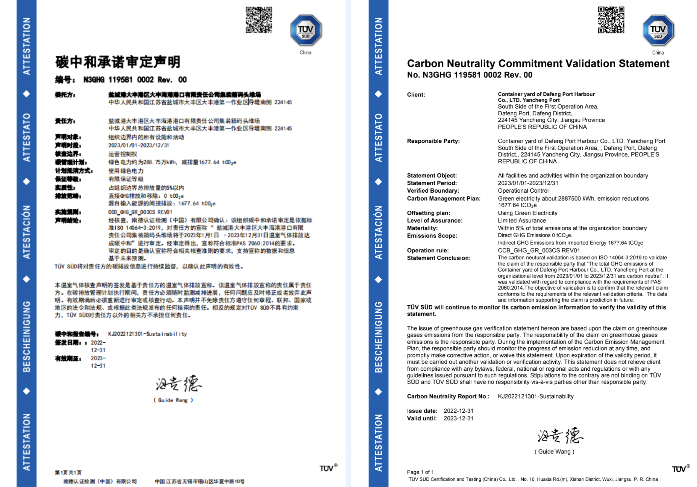 近日,盐城港大丰港区大丰海港港口有限责任公司集装箱码头堆场的2023年碳中和承诺,顺利通过TUV南德意志集团审定,并获得了碳中和承诺证书,成为国内首个获得碳中和承诺审定的堆场项目,为海角社区 落实国家“双碳”目标发挥了示范引领作用。