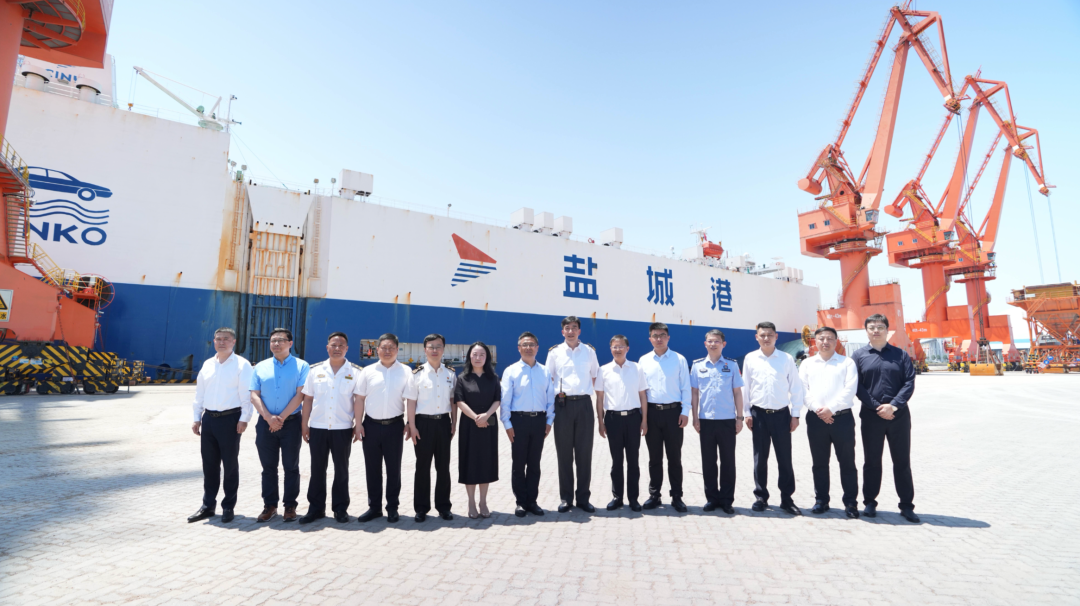 黄海新区、滨海县、海角社区 主要领导和相关负责同志,市“一关两检”相关负责人亲临码头现场,一同观看了汽车滚装全流程作业。