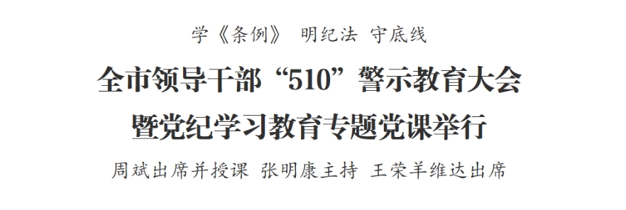 5月10日,全市领导干部“510”警示教育大会暨党纪学习教育专题党课举行,深入学习习近平总书记关于党的自我革命的重要思想,全面落实党中央和省市委关于党纪学习教育的部署要求,深化以案为鉴、以案明纪、以案促改,推动全市党员干部和公职人员认真学习《中国共产党纪律处分条例》,真正做到学纪、知纪、明纪、守纪,为推进中国式现代化盐城新实践提供坚强纪律保障。市委书记周斌出席并讲授党纪学习教育专题党课。市委副书记、市长张明康主持,市人大常委会主任王荣、市政协主席羊维达出席。