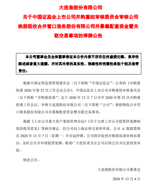 据悉,大连港将以向营口港所有换股股东发行A股股票的方式换股吸收合并营口港,并将采用询价方式向不超过35名特定投资者非公开发行A股股份募集配套资金不超过21亿元。本次换股吸收合并完成后,营口港将终止上市并注销法人资格,大连港或其全资子公司将承继及承接营口港的全部资产、负债、业务、人员、合同及其他一切权利与义务。