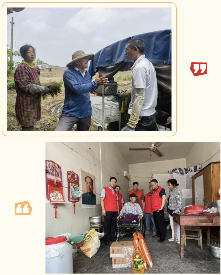 盐农华丰农业党支部积极组织党员开展志愿服务活动。党员志愿者们深入田间地头,围绕杂交制种水稻秧池病虫害防治方案,为种植户提供专业的技术指导和服务。大丰港水务发展公司党支部联合王港居委会开展困难居民与老党员慰问活动,为他们送上米、油、水等生活物资,并与他们亲切交流,了解他们的生活需求和实际困难,传递党组织的温暖与关怀,展现国企担当。