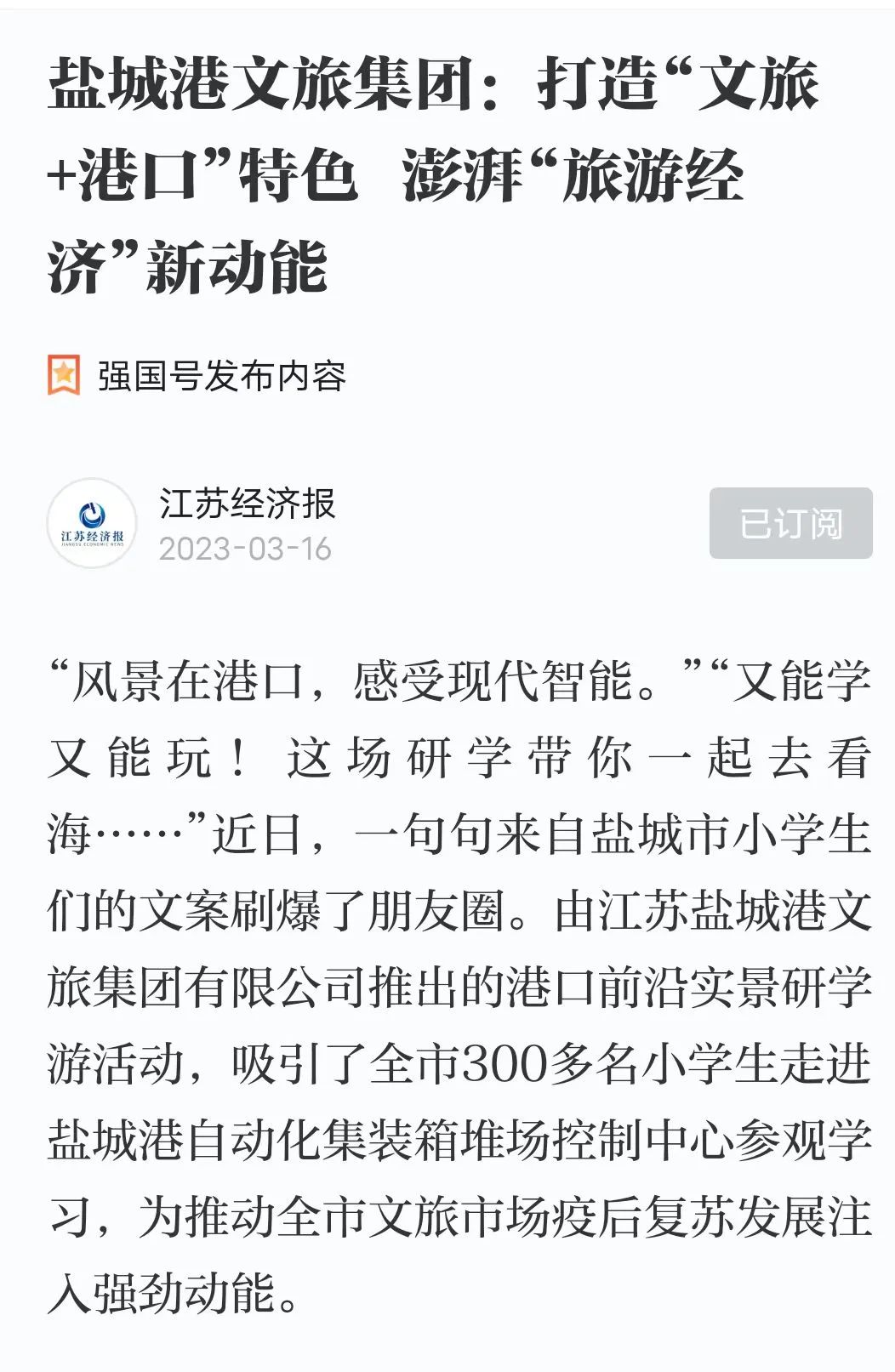 近日,江苏经济网、江苏经济报、学习强国等多家主流媒体平台集体为盐城港文旅集团点赞!以《盐城港文旅集团:打造“文旅+港口”特色 澎湃“旅游经济”新动能》为题对文旅集团在推动全市文旅市场疫后复苏发展方面取得的成绩进行了报道。