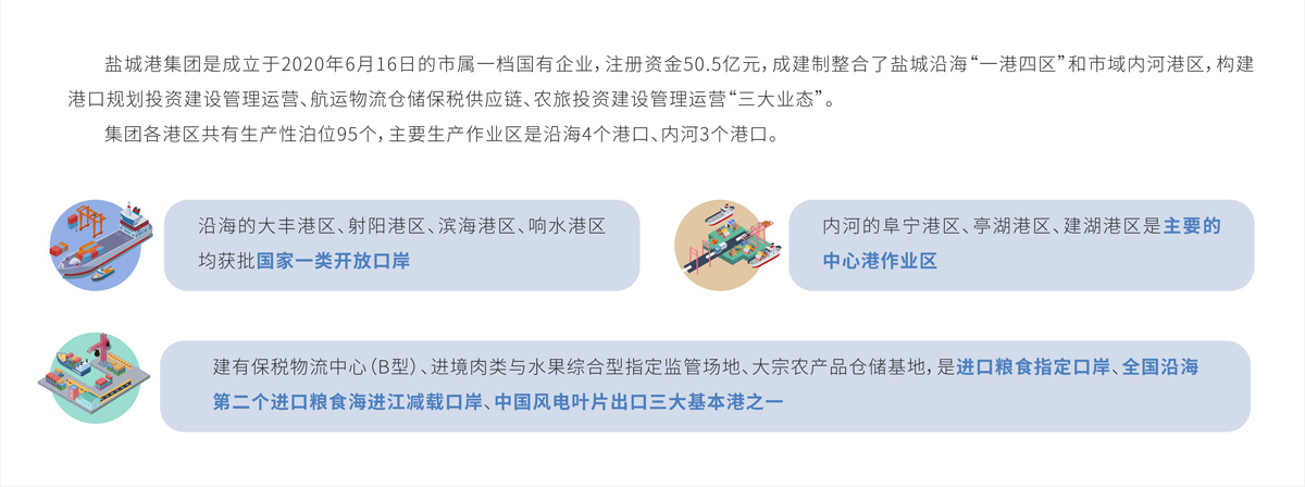成功跻身全国沿海主要港口20强,在“一带一路”倡议十周年之际,沿海“一港四区”全部实现对外开放且年吞吐量均超千万吨,6月16日正式开通中欧亚(接续)班列盐城号;
