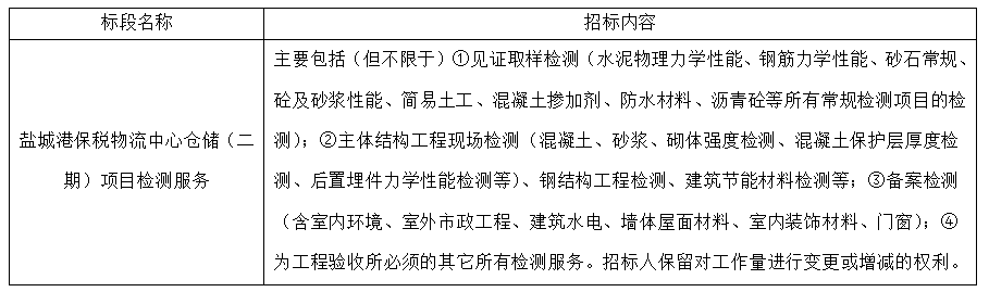 (7)项目标段划分:盐城港保税物流中心仓储(二期)项目检测服务共划分1个标段,标段信息如下: