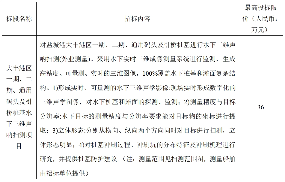 (5)项目标段划分:大丰港区一期、二期、通用码头及引桥桩基水下三维声呐扫测项目共划分1个标段,标段信息如下: