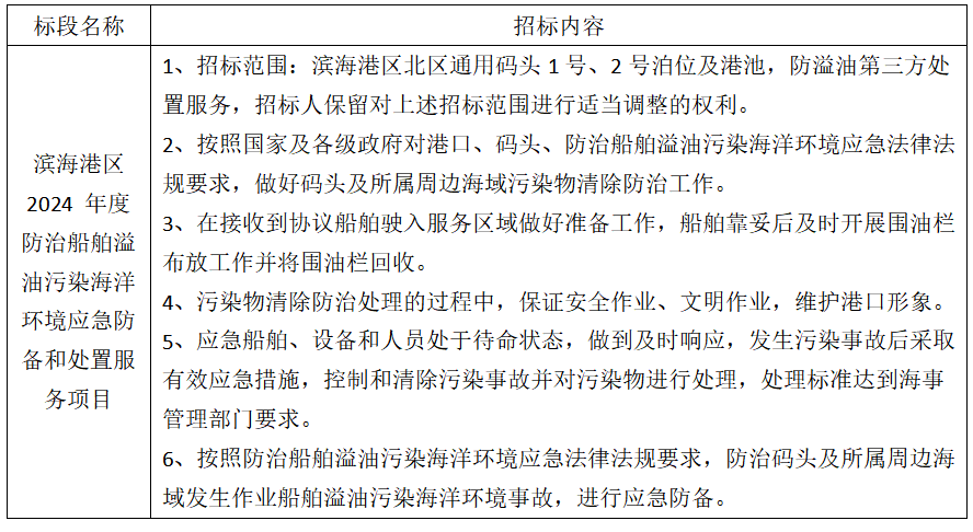 1、项目名称:滨海港区 2024 年度防治船舶溢油污染海洋环境应急防备和处置服务项目