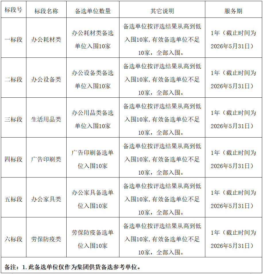 2、本次招标项目共分为六个标段,标段名称及备选数量如下: