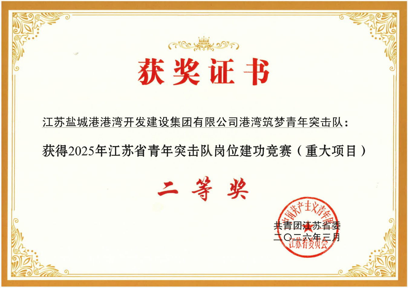 他们,就是江苏盐城港港湾开发建设集团有限公司“港湾筑梦青年突击队”。近日,这支由16名精兵强将组成的青年队伍,在江苏省青年突击队岗位建功竞赛中脱颖而出,斩获二等奖! 这份荣誉,是他们用智慧、奉献、拼搏、坚守换来的“硬核”证明。