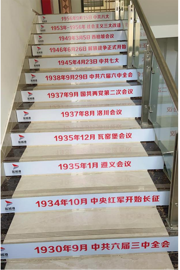 针对广大干部职工工作实际,响水港区精心设计,细心研究,将学习形式和载体不断创新。近日,响水港区创新打造“楼梯课堂”,将党史发展时间历程贴印在楼梯上,方便大家在上班闲暇时,无形地将党史知识学进脑子里。“楼梯课堂”的每一个阶梯同时也代表着党的每一个发展历程,一步一台阶,扎扎实实谱新篇。响水港区员工普遍反映这个学习方式有创意有实效,巩固加深了他们对党史的掌握程度,也提高了他们学习党史的兴趣。