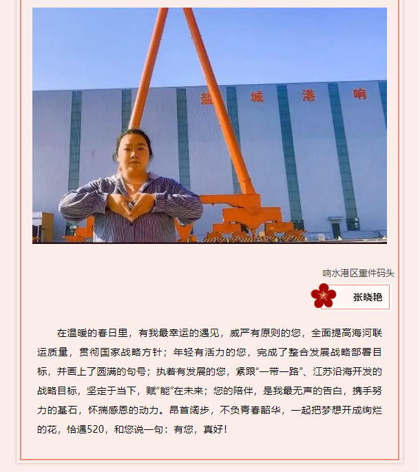 “520” 表白日 今天有人告白亲情 有人告白爱情 有人告白友情 “520”不仅有暖心的告白 更有坚毅的奋斗 盐城港人用奋斗 告白向海图强、筑梦海洋的初心和使命 一起来听听盐城港人的花式告白~ (节选)