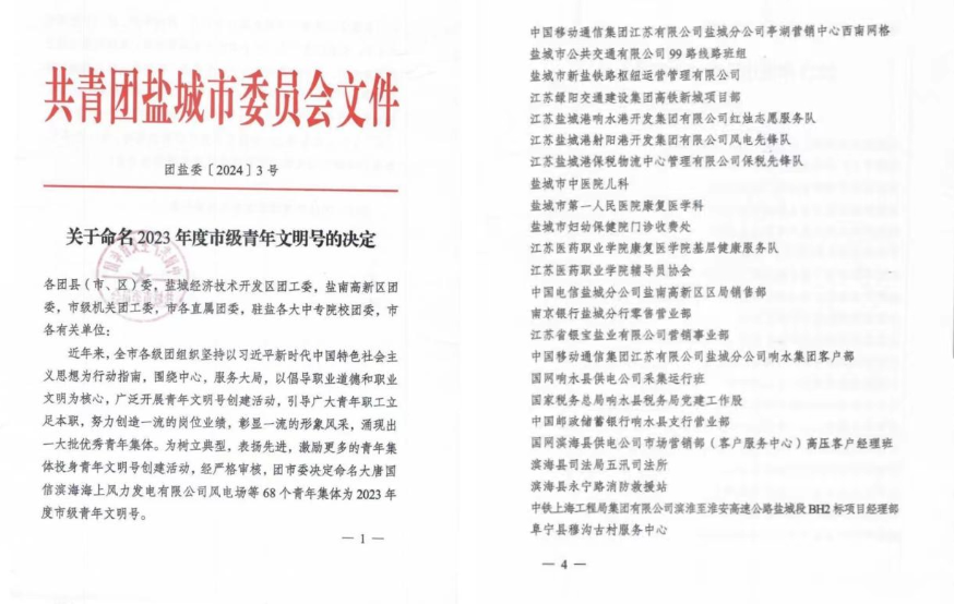 近日,共青团盐城市委发布《关于命名2023年度市级青年文明号的决定》,集团响水港开发集团红烛志愿服务队、射阳港开发集团风电先锋队、保税物流中心保税先锋队三家集体获评市级青年文明号称号。