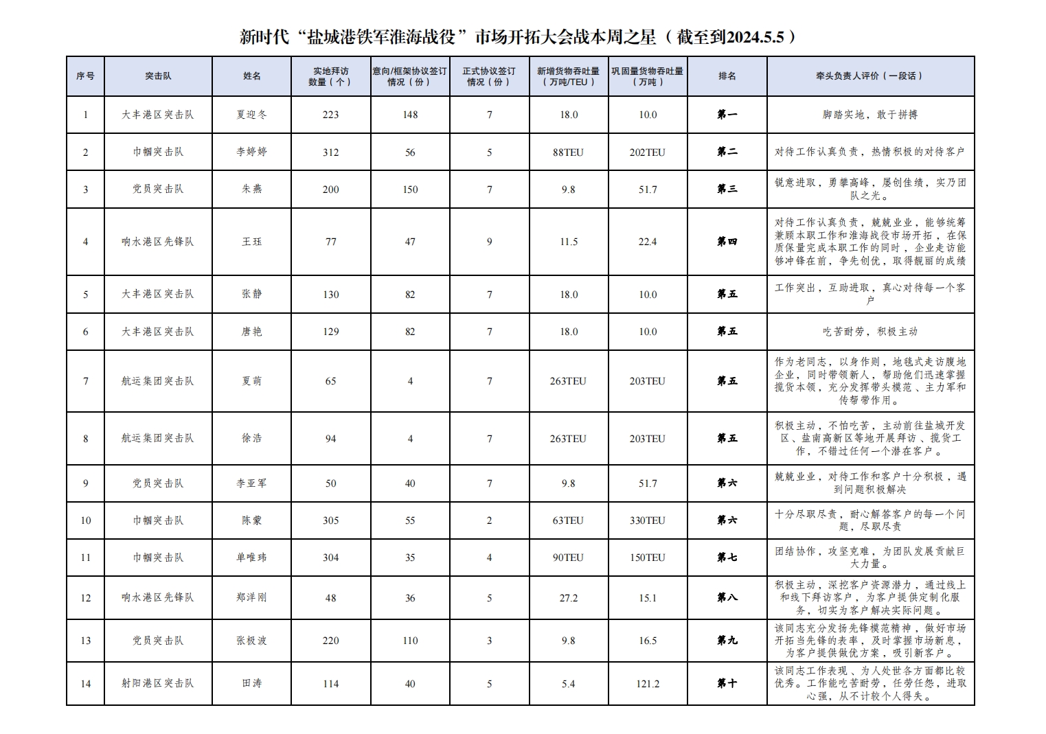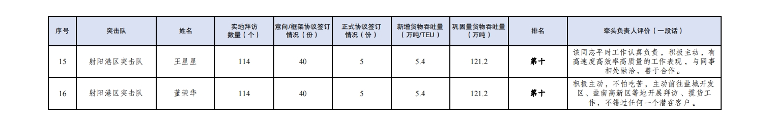 第一名:大丰港区突击队 夏迎冬(拜访客户223家,签订意向协议148份,签订正式协议7份,新增货物吞吐量18万吨,巩固量货物吞吐量10万吨);