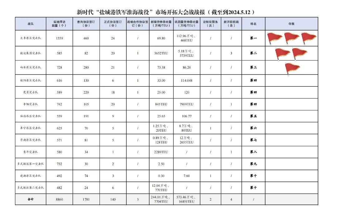 第一名:大丰港区突击队 夏迎冬(拜访客户263家,签订意向协议165份,签订正式协议17份,新增货物吞吐量13.8万吨,巩固量货物吞吐量39.8万吨);
