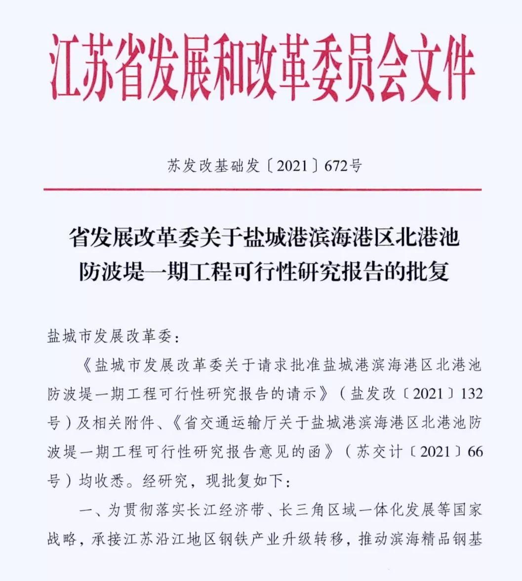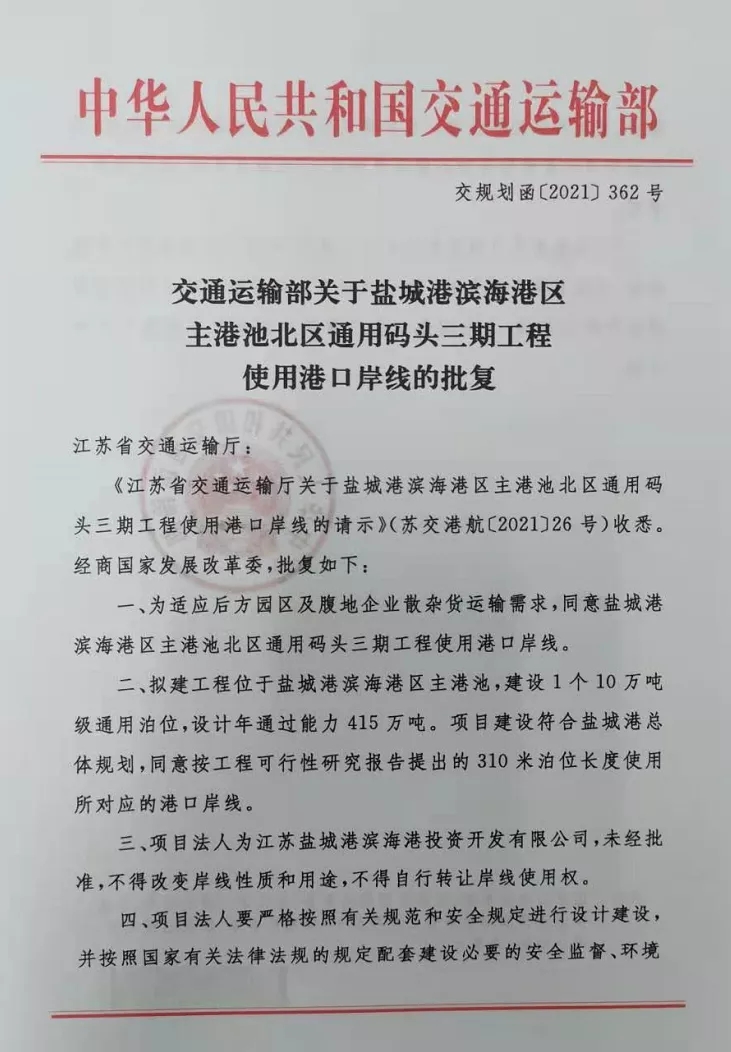 近日,交通运输部批复盐城港滨海港区主港池北区通用码头三期工程使用港口岸线的请示(交规划函〔2021〕362号)、省发展改革委批复盐城港滨海港区北港池防波堤一期工程可行性研究报告(苏发改基础发〔2021〕672号),标志滨海港区重大项目前期工作取得突破性进展。