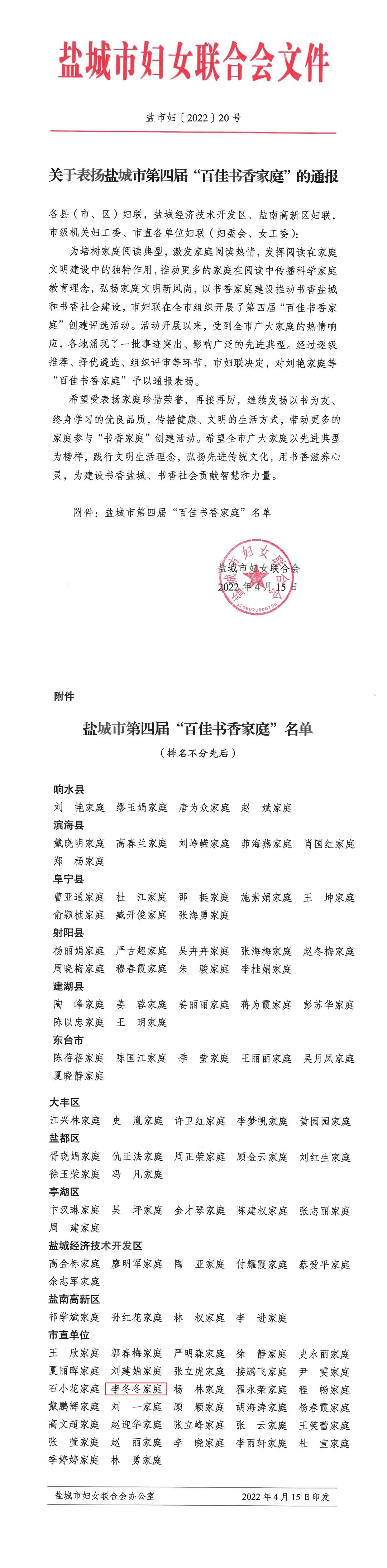 好消息!集团职工李冬冬家庭荣获盐城市“百佳书香家庭”称号
