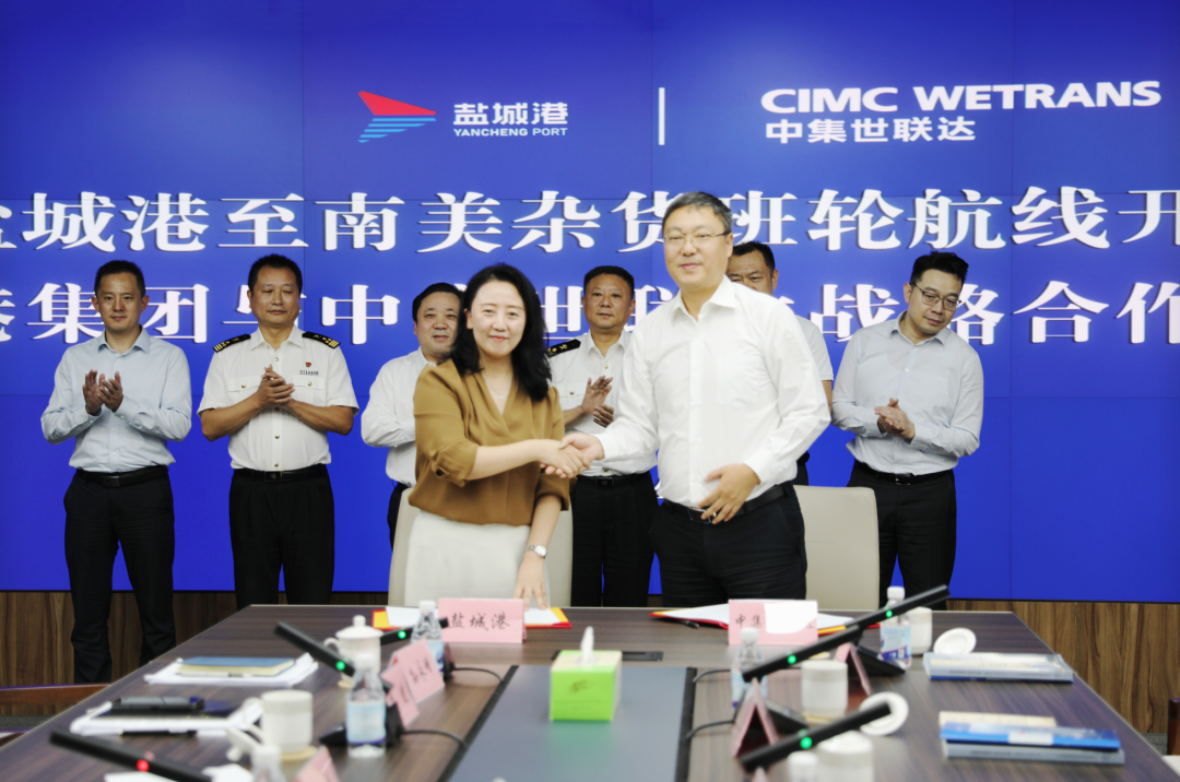 9月17日,盐城港至南美杂货班轮航线开航暨海角社区 与中集世联达战略合作签约仪式成功举行。集团党委书记、董事长、总经理周正雄主持活动。中集世联达长江物流副总经理刘羽,盐城海关二级高级主办李健,盐城海关驻大丰港海关办事处主任崔克劲,集团总经理助理孙永峰等参加并鉴签。盐城港港口公司董事长袁欣代表集团与中集世联达长江物流公司签订合作协议。