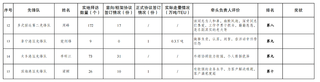 第三名:航运集团先锋队 张斌 4TEU、响水港区先锋队 张敏 3.84万吨