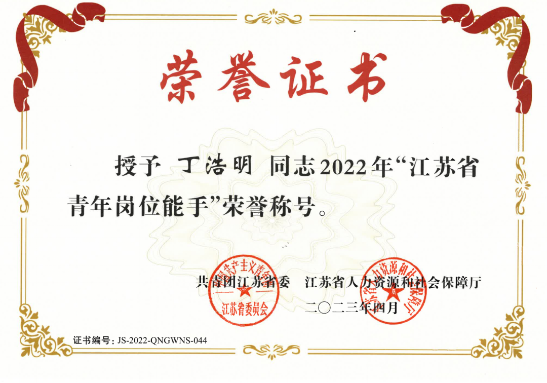 近日,共青团江苏省委发布《关于公布2022年江苏省(杰出)青年岗位能手认定结果的通知》,我集团丁浩明同志荣获“江苏省青年岗位能手”荣誉称号。