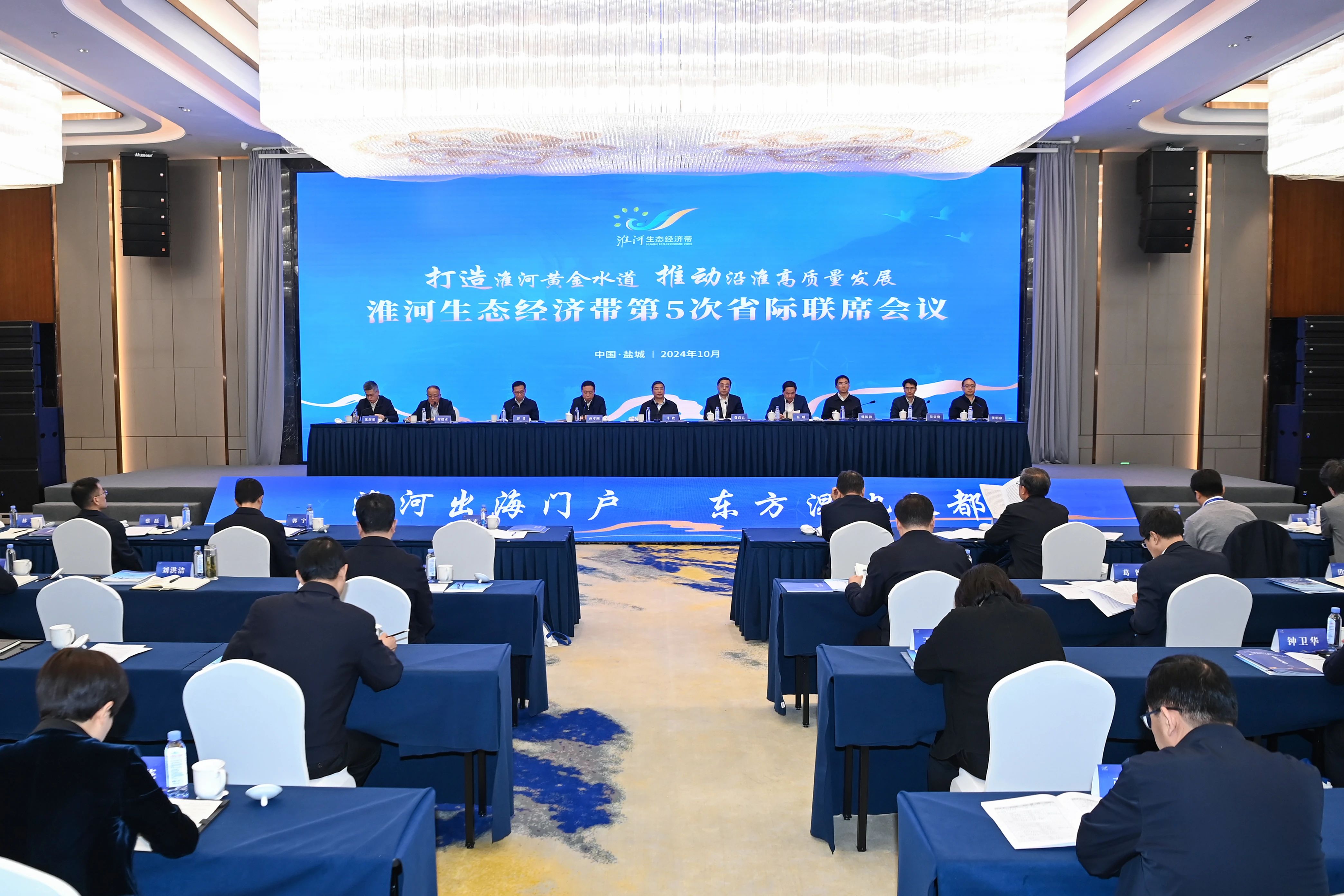 10月29日上午,淮河生态经济带第五次省际联席会议在我市召开,总结交流沿淮地区协同发展工作经验,谋划新一轮省际重点合作事项,推动淮河生态经济带高质量发展。省委常委、常务副省长马欣主持会议。安徽省委常委、常务副省长费高云,河南省委常委、常务副省长孙守刚,山东省副省长温暖,湖北省副省长彭勇,国家发展改革委区域协调发展司副司长韩振海,生态环境部淮河流域生态环境监督管理局副局长程绪水,水利部淮河水利委员会副主任吴贵勤,市委副书记、市长张明康出席会议。