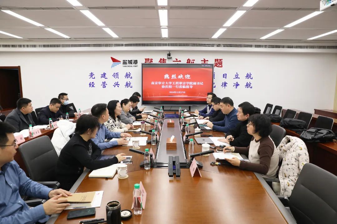 袁欣对徐庆阳一行的到来表示欢迎,并介绍了盐城港相关情况。她说,自集团成立以来,集团高度重视依法治企、合规管理工作,始终将审计工作摆在重要位置,扎实推动“五大监督”“双体检”等创新举措,不断提高风险防范能力,着力提升合规管理水平。当前,盐城港充分发挥审计工作“找问题、明方向”作用,对重大项目开展“回头看”,确保手续齐全、流程规范,依法合规推进项目建设。同时,集团聚焦人才引进,不断扩充审计人才库,为未来健康可持续发展提供坚实人才支撑。南京审计大学作为审计类人才的智库和摇篮,在人才培养等方面拥有专业的师资力量,恳请南京审计大学在财务、审计、法务、融资专业人才培养等方面给予盐城港更多支持,为盐城港一体化融合高质量发展注入新活力。