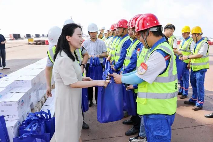 活动现场,袁欣与大家亲切交谈,详细询问一线职工的工作状态和实际需求,对他们顶烈日、战酷暑,始终坚守岗位的敬业精神表示衷心感谢,叮嘱他们要注意防暑降温,做好个人防护,并将防暑降温“清凉礼包”送到职工代表手上。她说,当前高温、恶劣天气逐渐增多,各单位要切实做好夏季防暑降温工作,动态调整作业时间,为广大员工提供清凉舒心的休息场所,全面保障人身安全。同时,要时刻绷紧安全这根弦,聚焦生产、消防重点领域,常态化开展安全隐患排查治理工作,做好值班值守和应急处置,确保港区安全生产形势稳定。