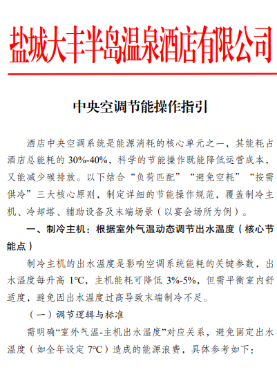 酒店专门编制空调节能操作指南,围绕“负荷匹配、避免空耗、按需供冷”三大原则,通过灵活调节水温、分时运行风机、合理预判宴会需求等方式,从设备运行到场景适配全流程优化,节电效果显著。