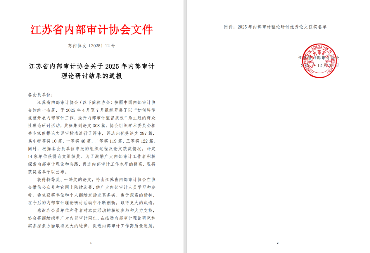 12月24日,江苏省内部审计协会公布了2025年度省内部审计理论研讨活动获奖结果,集团审计部报送的《国企内部审计科学规范与提质增效路径探索——基于海角社区 实践的分析》论文荣获一等奖。