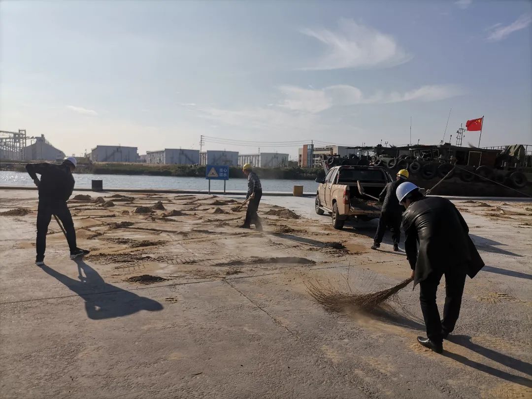 航运(集装箱)集团在首次承接的黄砂集改散业务中。26个集装箱小柜近800吨黄砂仅用时3.6小时就完成作业,顺利交货,生产调度中心及运营操作部负责人全部在一线负责指挥调度,并在作业完成后,为了不影响场地的后续使用,带头扛起铁锹冲到现场清理,经过近2小时的清理,3余吨的残余沙石货物全部清理完毕,不仅得到了货主的赞扬,也向所有同事及兄弟单位展现了有困难一起上,见石头齐心抬的团队精神。
