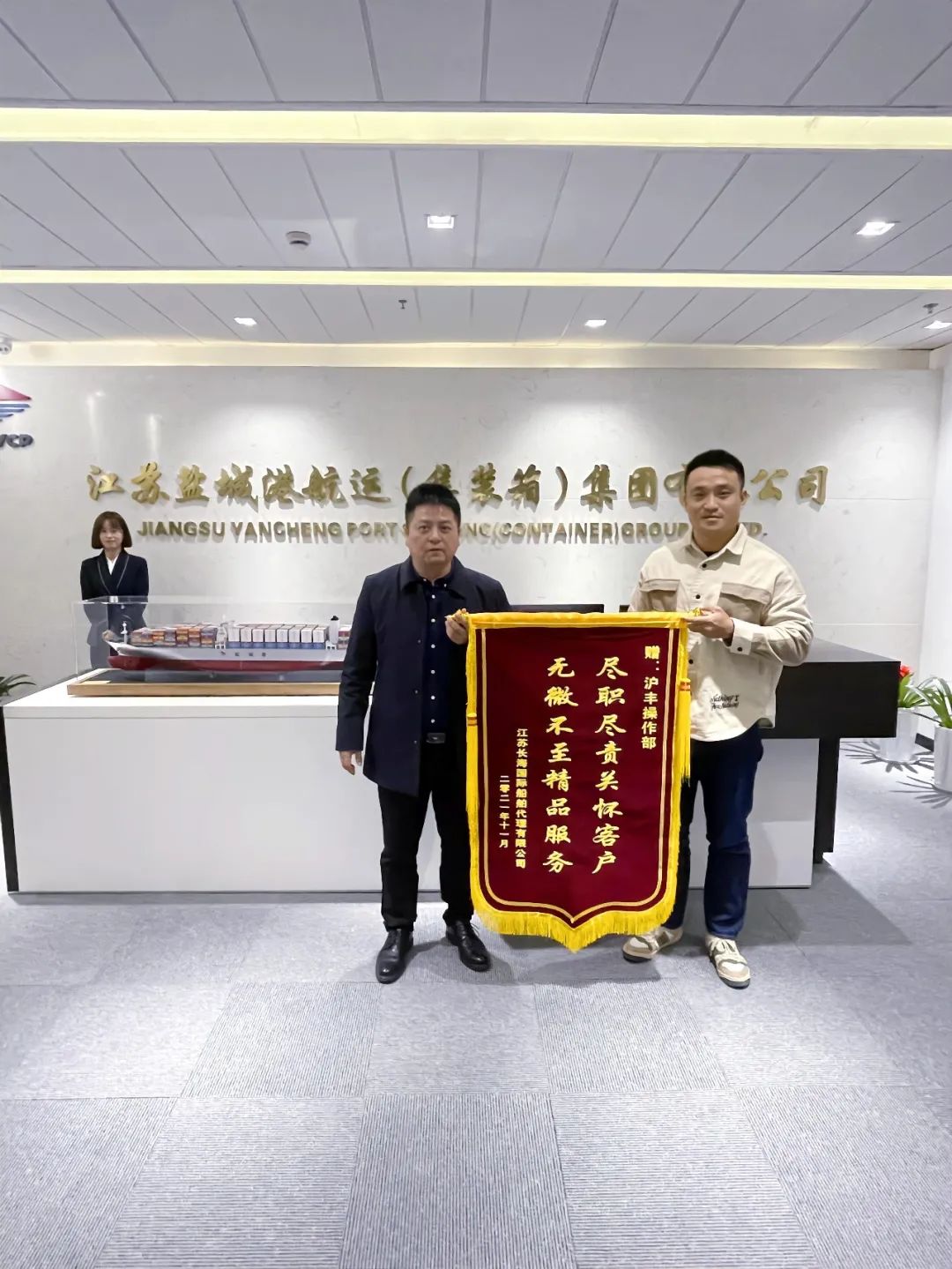 11月12日,江苏长海国际船舶代理有限公司业务经理吴长春一行拜访江苏沪丰集装箱物流有限公司,将一面写有“尽职尽责关怀客户,无微不至精品服务”的锦旗送到沪丰公司,对沪丰公司操作部近年来提供的优质高效服务表示感谢。