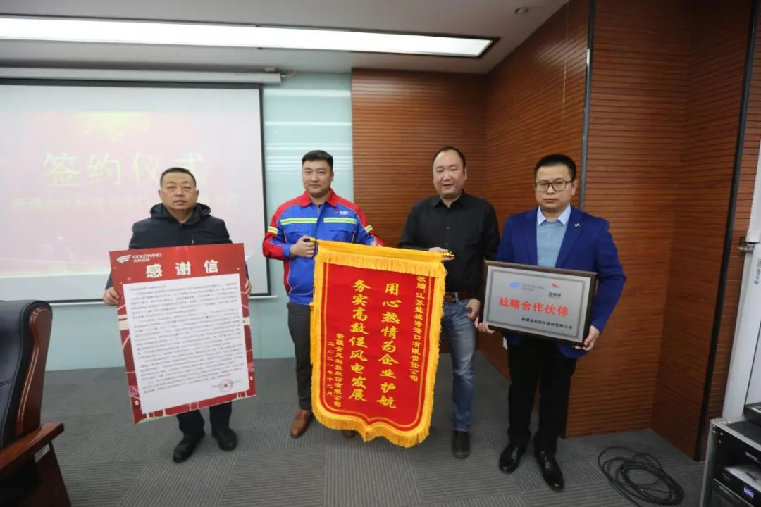 签约前,金风科技向港口公司赠送锦旗和感谢信,对港口公司一如既往为企业发展提供高效、便捷的物流服务表示感谢。